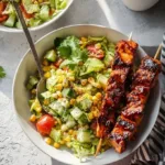 Preheat your grill to medium-high heat. Thread the marinated chicken onto the pre-soaked wooden skewers, making sure to leave a little bit of space between each piece for even cooking. Grill the skewers for about 10–12 minutes, turning occasionally, until the chicken is cooked through and has nice grill marks.Meanwhile, grill the corn for an extra boost of flavor (if you’re including it). Once grilled, let it cool and slice the kernels off the cob.