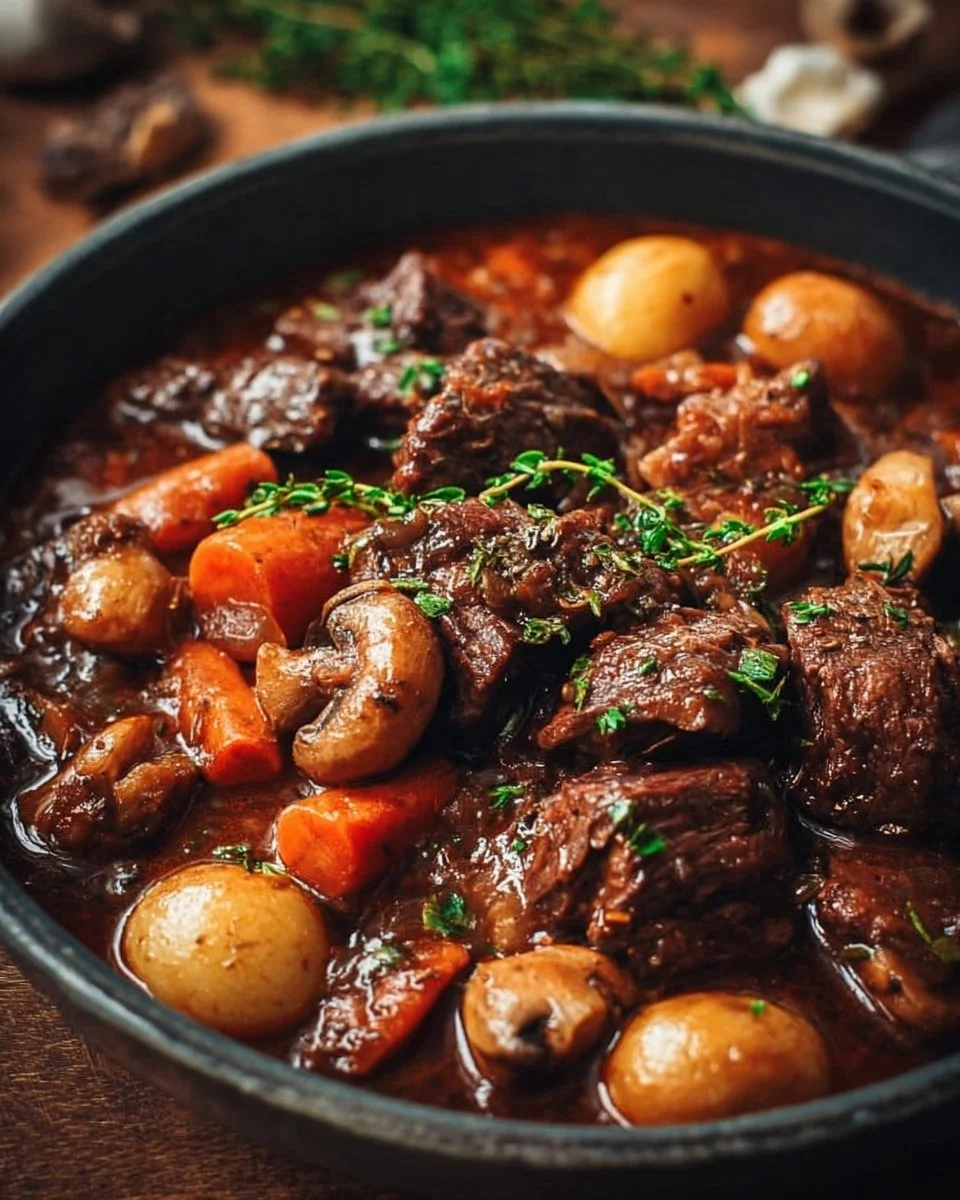 A classic French stew that combines hearty beef, aromatic vegetables, and rich red wine for a comforting dish perfect for family dinners.
