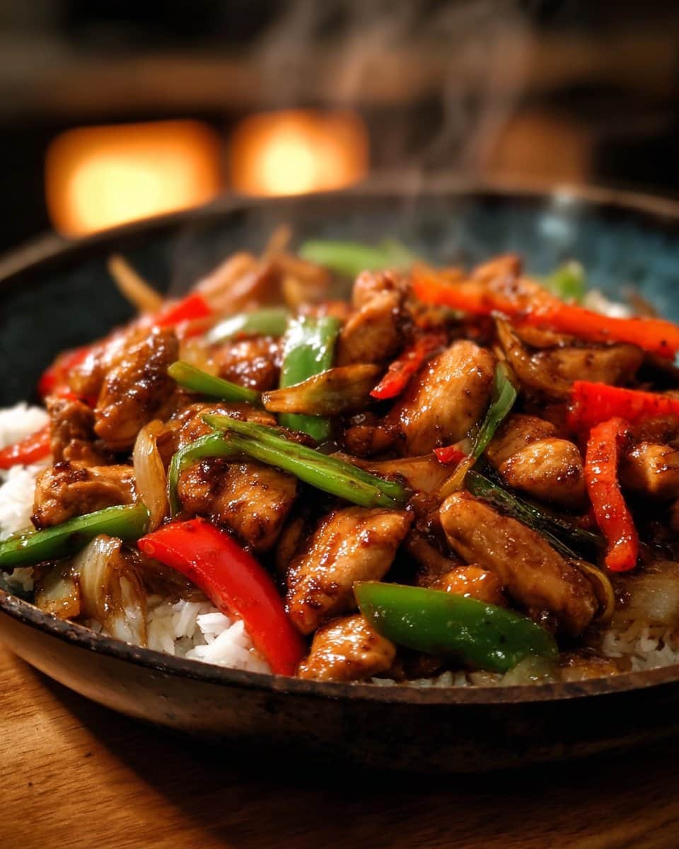 A delightful stir-fry dish combining tender chicken and colorful vegetables with the invigorating heat of black pepper, perfect for busy weeknights.