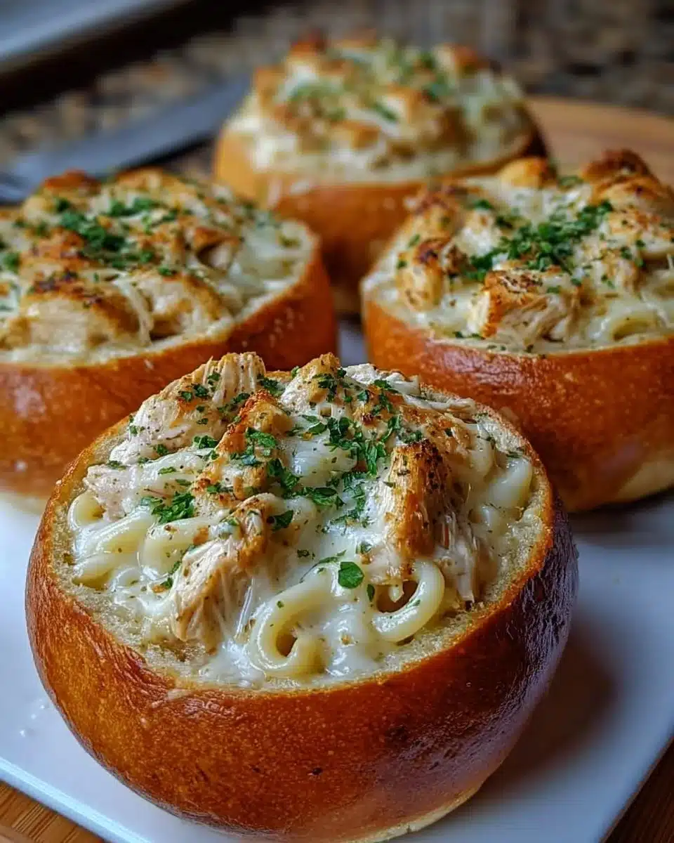 Delicious chicken Alfredo served in crispy garlic butter bread bowls for a comforting meal.