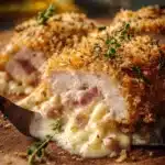 A comforting dish that combines tender chicken, savory ham, and creamy Swiss cheese, baked under a crispy breadcrumb topping.