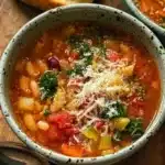 A healthy, filling soup packed with vegetables, beans, and pasta, perfect for lunch or dinner.