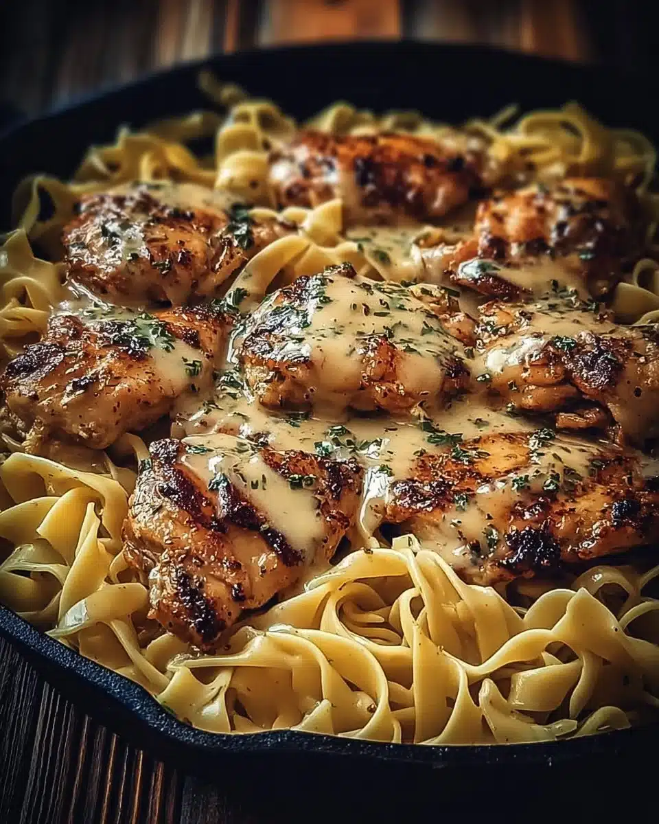Serve this dish warm, right from the skillet. You can plate the buttered noodles first, then top them with slices of chicken. Add a sprinkle of freshly chopped parsley for a pop of color. This meal pairs well with a simple side salad or steamed vegetables to lighten it up.