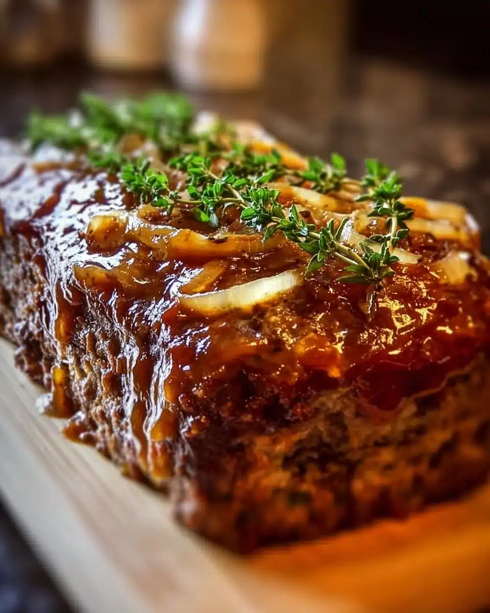 A delicious twist on classic meatloaf, combining savory caramelized onions and ground beef for a rich taste.
