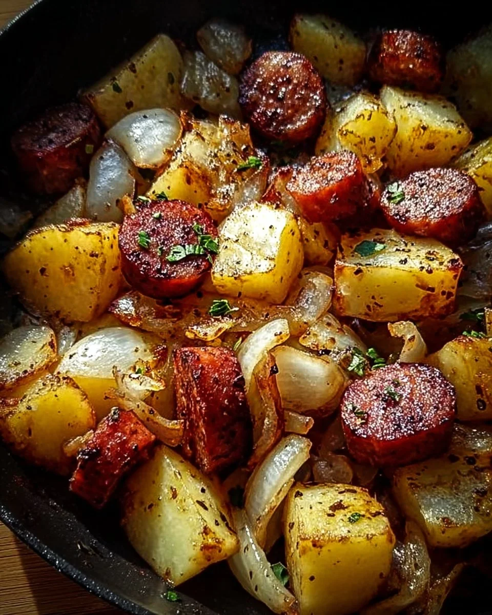A hearty dish of fried potatoes, onions, and smoked Polish sausage that combines comfort and flavor, perfect for any meal.