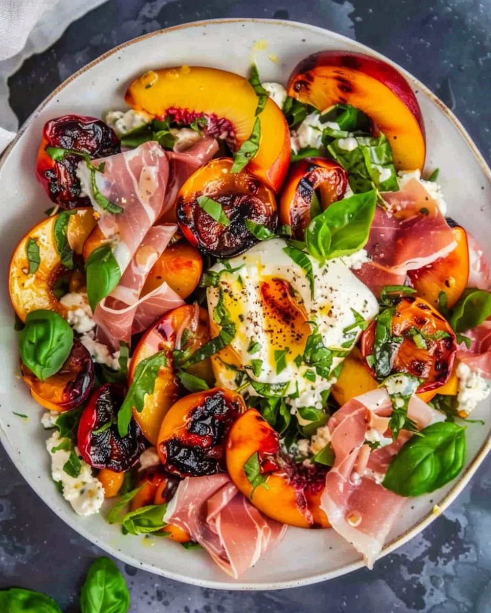 A vibrant summer salad featuring grilled nectarines, creamy burrata, and savory prosciutto, enhanced with a fresh vinaigrette.