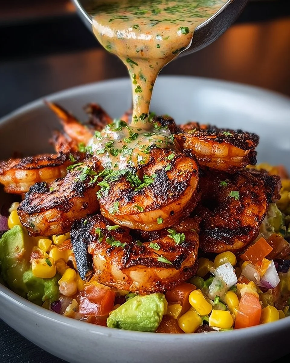 A fresh, vibrant meal featuring charred shrimp, juicy corn salsa, buttery avocado, and a tangy creamy garlic sauce.