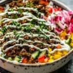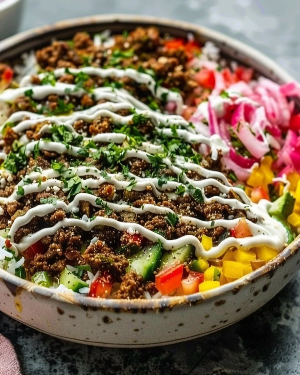 A delightful twist on classic Middle Eastern street food featuring seasoned ground beef, fresh vegetables, and a bed of rice or quinoa, topped with tahini sauce or yogurt.