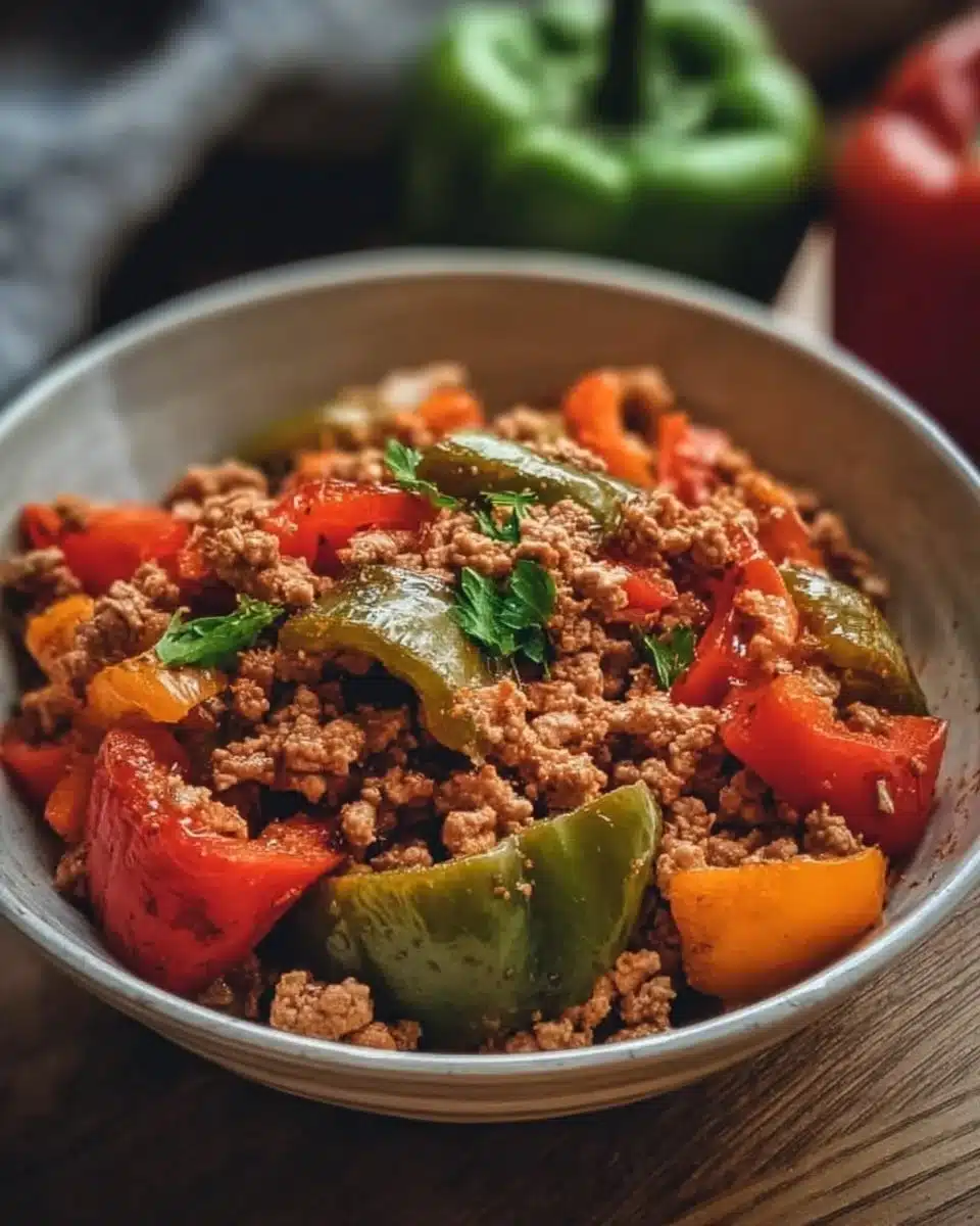 A delicious and healthy dish featuring ground turkey, colorful bell peppers, and spices, perfect for busy weeknights.