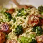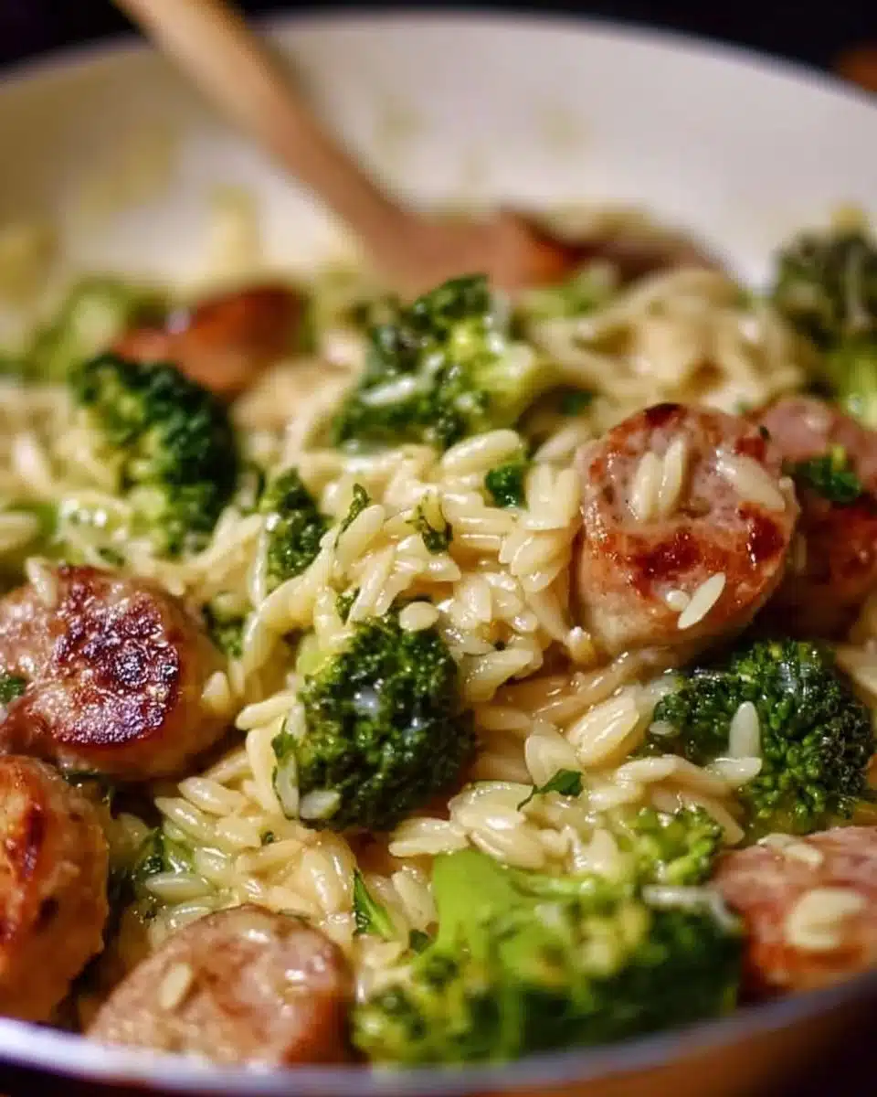 A delightful one-pan dish combining creamy orzo, savory chicken sausage, and healthy broccoli.