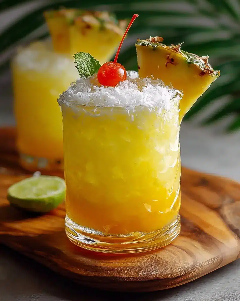 Serve Pineapple Coconut Punch in tall glasses filled with ice. You can garnish each glass with fresh pineapple wedges, a few maraschino cherries, and mint sprigs for an extra touch. This makes it look appealing and even more refreshing!
