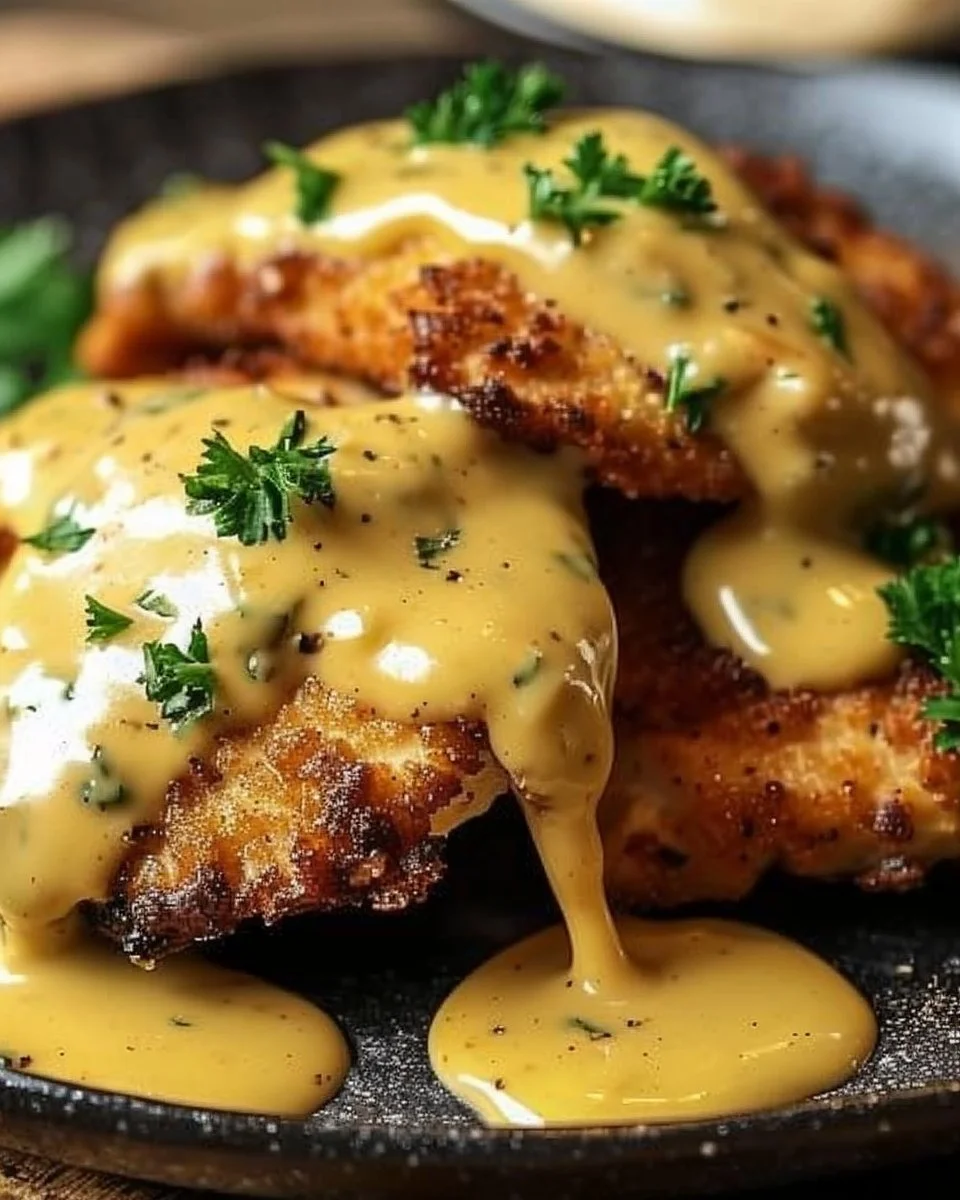 A delightful dish featuring crispy, breaded chicken with a rich, tangy mustard-cheddar sauce, perfect for family dinners or impressing guests.