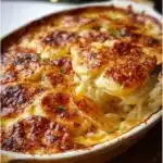 A creamy and cheesy delight with layers of thinly sliced potatoes in a rich four-cheese sauce, perfect for gatherings and cozy dinners.