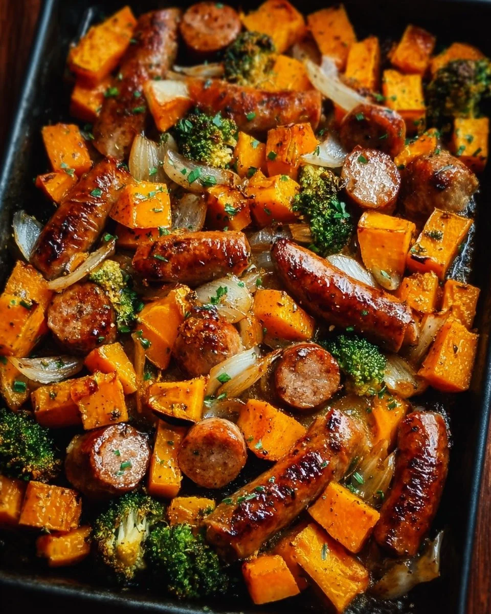 A delightful combination of savory sausage, sweet potatoes, and vibrant broccoli, all roasted with a sweet and tangy honey garlic sauce, perfect for busy weeknights.