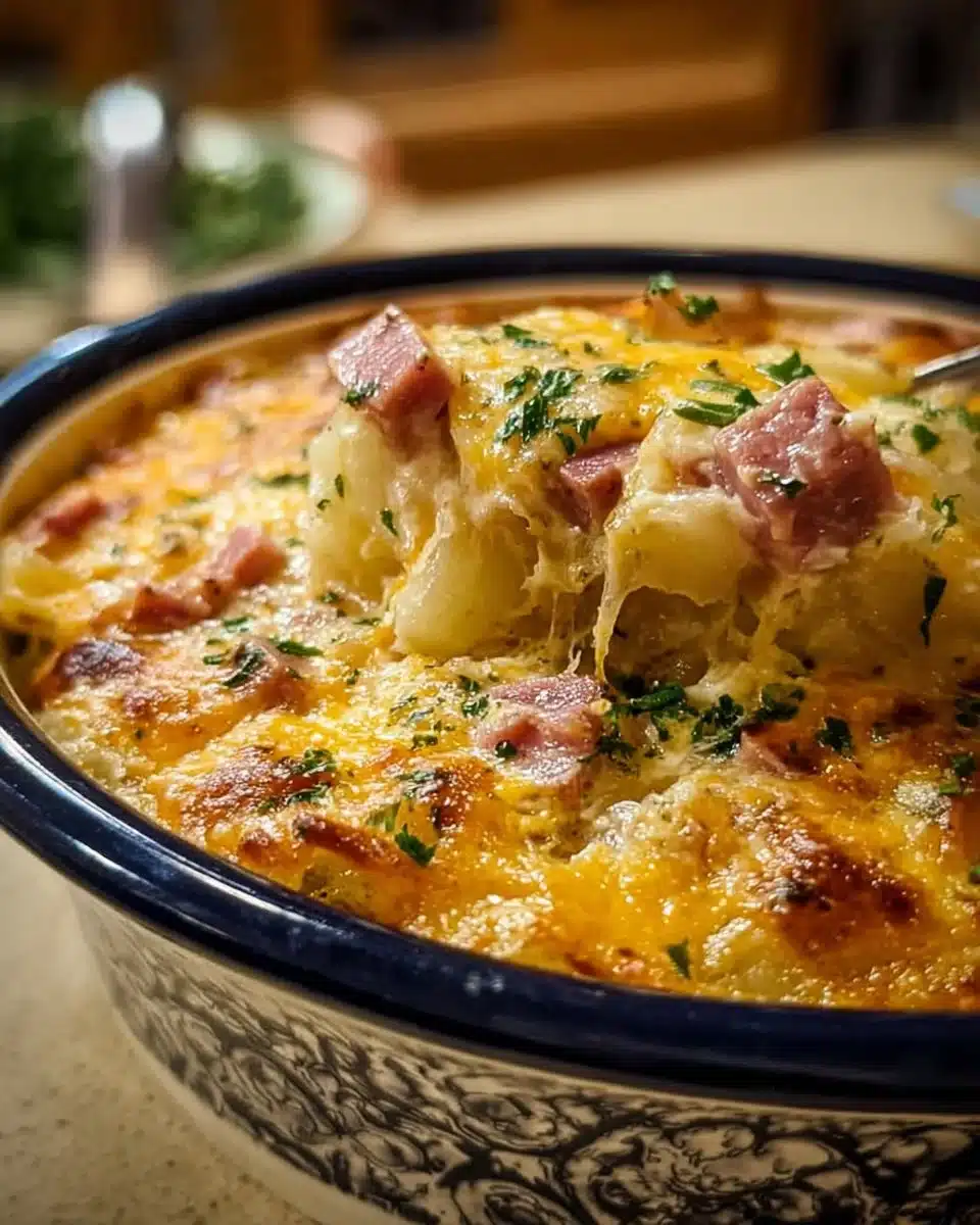 A delicious and comforting casserole made with tender potatoes, hearty ham, and gooey cheese, all cooked in a slow cooker.
