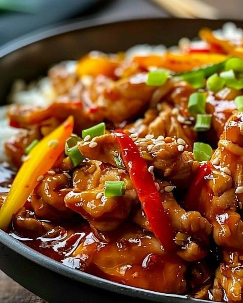 A delightful dish combining tender chicken with sweet chili sauce and fresh vegetables, cooked effortlessly in a slow cooker.