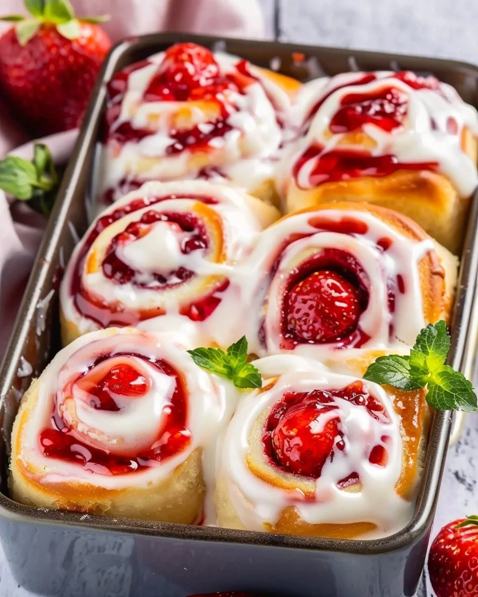 Gently arrange the sliced strawberries on top of the rolls. The sweetness of the strawberries balances the richness of the cheesecake and cinnamon filling, creating a perfect flavor combination.