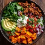 A vibrant and satisfying Sweet Potato Taco Bowl packed with roasted sweet potatoes, savory ground beef (or meat alternative), and fresh toppings, perfect for any night of the week.
