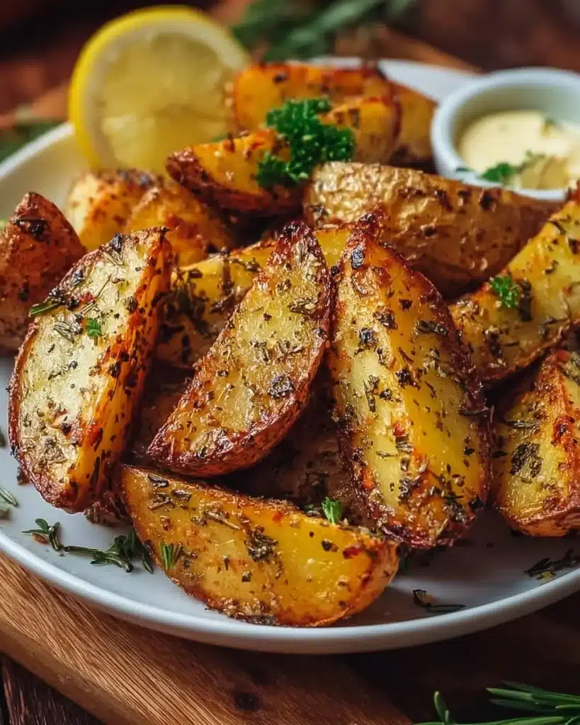 Plate of herb roasted potato wedges garnished with fresh herbs