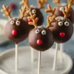 - Melt remaining chocolate, dip cake pops, and press pretzels for antlers; attach candy eyes and Rudolph’s nose.